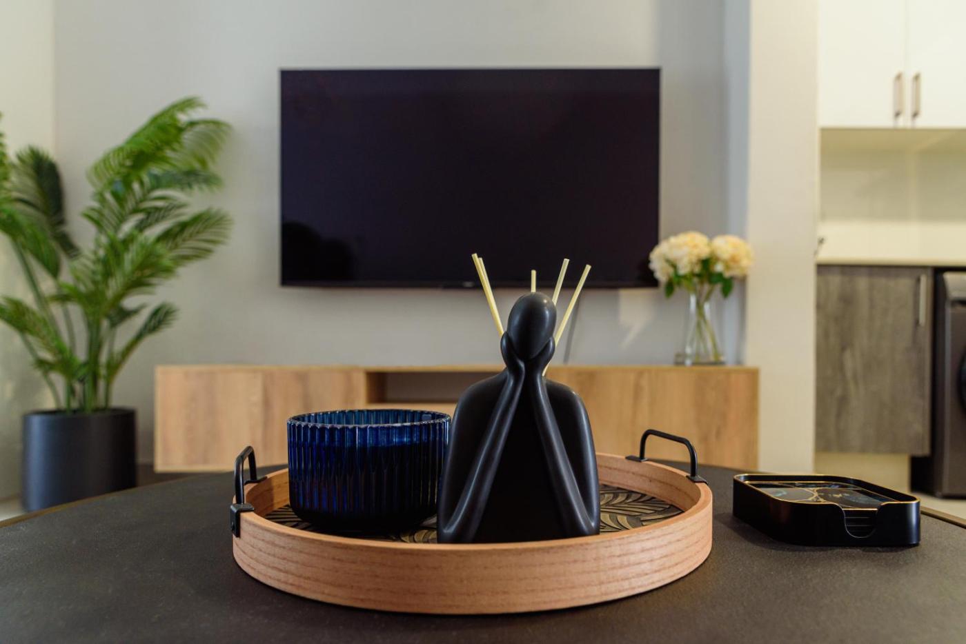 Studio Apartment. The air-conditioned apartment has 1 bedroom and 1 bathroom with a bath and a shower. Meals can be prepared in the well-fitted kitchen, which has a stovetop, a refrigerator, kitchenware and an oven. The apartment features tiled floors, a seating area with a flat-screen TV, a washing machine, a wardrobe as well as garden views. The unit has 1 bed.